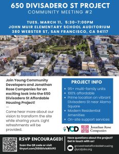 The Jonathan Rose Company is slated to deliver 95+ affordable apartments to the Alamo Square neighborhood at the corner of Grove & Divisadero St. At this event, they will provide important information about the design process and how this project will shape the neighborhood while simultaneously collecting feedback from attendees. This is an opportunity for neighborhood residents to learn more about the project while making their voice heard. Light refreshments will be provided. RSVP here!