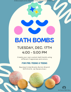 Create your own custom bath bomb using different fragrances and colors. This activity is perfect for a last-minute gift. It is for ages 10–18.