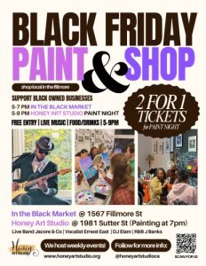 Come support small local businesses with Honey Art Studio and In The Black, on Black Friday, on Friday, November 29th from 5-9pm, at 1981 Sutter and 1567 Fillmore Streets. Stop by for free live music, browse local vendors, and have fun expressing your creativity. There will be a 2 for 1 deal on painting classes for this Friday only. If painting is not your thing, feel free to drop by with friends starting at 5pm and enjoy free live music with drinks and snacks for purchase.