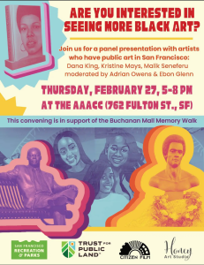 Join artists Dana King, Kristine Mays, and Malik Seneferu in a panel discussion moderated by Adrian Owens and Ebon Glenn. This artist panel will discuss Black public art in San Francisco, as well as the art proposals currently being considered for the Memory Walk at Buchanan Street Mall.
