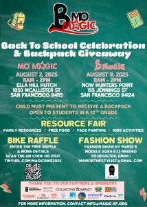 Mo’MAGIC’s 16th Annual Backpack Giveaway will take place on Saturday, August 2nd, 2025, at Ella Hill Hutch Community Center, 1050 McAllister Street, SF 94115.