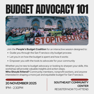 During this 1.5 hour workshop, Anya will provide insight into San Francisco’s budgeting process and answer any questions you may have. Space is extremely limited, please fill out 1 registration form per attendee. This workshop will be immediately following our Monthly MAGIC Convener Meeting, from 11a-1p. If you’d like to attend the Convener Meeting, sign up here for In-person attendance or Virtually on Zoom. Register here!