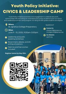 This is a FREE, week-long summer camp for middle schoolers (rising 6th-8th graders). Aspiring campers from underserved backgrounds can learn about public speaking, leadership, and issues facing San Francisco and the country. This year’s Civics and Leadership camp will run from June 9-13, 2025 at St. Ignatius College Preparatory from 9a-3p. All who are eligible are accepted into the program. Register here!