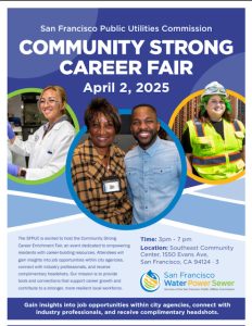 The San Francisco Public Utilities Commission is sponsoring a Community Strong Career Fair. This event is dedicated to empowering residents with career-building resources. Attendees will gain insights into job opportunities within city agencies, connect with industry professionals, and receive complimentary headshots.