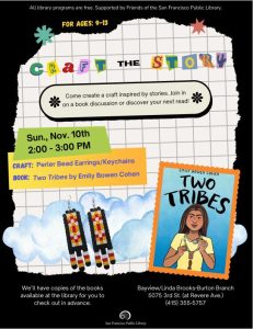 Create perler bead earrings or a keychain inspired by the Muscogee beadwork in Emily Bowen Cohen’s graphic novel, Two Tribes, and join in on a low-key discussion even if you haven’t finished the book. We’ll have copies on hold at Bayview/Linda Brooks-Burton Branch for you to pick up in advance. Snacks provided.