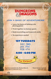 Join a team of adventurers and learn the basics of Dungeons & Dragons. Create characters and work together to navigate fantasy quests, building literacy, storytelling, and teamwork skills. For ages 10–17.