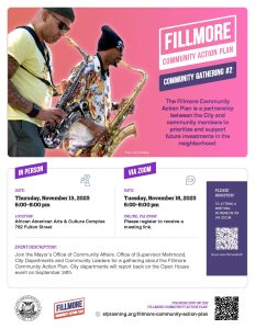 Join the Mayor’s Office of Community Affairs, Office of Supervisor Mahmood, and City Departments for this community gathering to hear an overview of the community planning process to develop the Fillmore Community Action Plan and report back on what they heard at the 9/24 Open House. Representatives from several City agencies will share information on existing efforts in the neighborhood and will be available to receive feedback. RSVP here! In-person date is Thursday, November 13 and Virtual event is Tuesday, November 18.