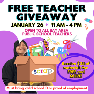 Just what you wished for! Free Teacher Giveaway is back at SCRAP! We’re kicking off the New Year with new classroom supplies! We have SO MANY materials set aside that are ready to be taken into your classrooms–for free! On top of that, you’ll be able to shop the Depot and walk away with $25 worth of free materials. Staplers, tape and tape dispensers, paper, notebooks, markers, pencils-they’re all waiting for you at SCRAP! This event is only open to Bay Area Public School teachers and public school affiliated afterschool teachers. Please bring your ID or other proof of identification. Please note that on this day SCRAP will be open to Public School teachers ONLY. We will be closed to all other customers. Reserve your spot today!