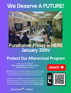 Collective Impact is having their second fundraising event to support their summer program on Friday, January 30th from 3-5pm in the Ella Hill Hutch Center parking lot. Join us for a day of community building, food, and fun to help bring awareness to all of the wonderful work done at Ella Hill Hutch Community Center. Donations can be made in-person or via the QR code on the flyer.