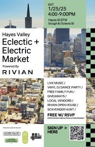 The night market will highlight local Hayes Valley artisans, and feature electrifying live music, interactive exhibits, family-friendly lawn games and more. Local eateries will have discounted food and drink. This family friendly event will expand into the PROXY space, as well as the new Rivian Space on Fell Street.