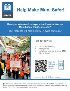 Help Make Muni Safer! MAGIC has partnered with SFMTA to collect your input regarding safety on Muni. Your response will help the SFMTA make Muni safer. Share the survey with anyone you know who rides Muni. Complete the survey by February 28th and you will have the chance to win a $100 Clipper card! The survey takes 10-15 minutes and is anonymous.