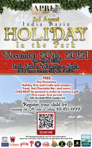 Join India Basin’s 3rd Annual Holiday in the Park. On Friday, December 20th, from 4pm to 8pm, at 900 Innes Avenue. Free Toy giveaway, Holiday arts and crafts, jumpers, Food, Hot Chocolate Bar, and more. The Child Must be present in order to receive a gift. First Come, First Served. Register your child – 2024 India Basin “Holiday in the Park” Event