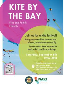 Bring your own kite, borrow one of ours, or decorate one to fly. Park goers can look forward to learn to fish, eating some free food, and grooving to the tunes of local DJ BeatsMe, thanks to the generous support of Parks California. Engage with local non-profits and partners, including Literacy for Environmental Justice, the Wild Oyster Project, the Crosstown Trail, Faces SF, and the California State Parks Foundation.