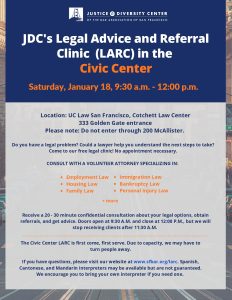 The Justice and Diversity Center is hosting a clinic that is only in-person at UC Law San Francisco. Clients will be interviewed briefly, connected to an attorney for a consultation, or given another referral. We will stop accepting clients at 11:30 am or earlier due to capacity. This is a walk-in clinic and no appointment is needed. These clinics are intended for low-income members of our community and can’t address homeowner or HOA issues.