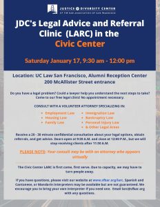 This clinic is only in-person at UC Law San Francisco. Clients will be interviewed briefly, connected to an attorney for a consultation, or given another referral. We will stop accepting clients at 11:30 am or earlier due to capacity. This is a walk-in clinic and no appointment is needed. These clinics are intended for low-income members of our community and can’t address homeowner or HOA issues.