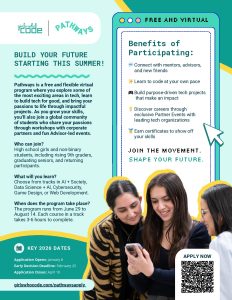 Pathways is a free and flexible virtual program where girls can explore some of the most exciting areas in tech, learn to build tech for good, and bring your passions to life through impactful projects. Open to all high school girls/non-binary students including rising 9th graders and graduating seniors. Apply here! Final registration date is Friday, April 10th.