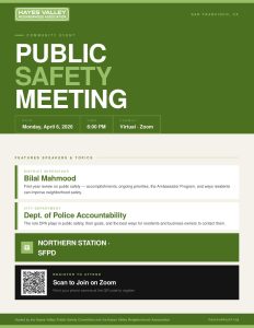 This month’s meeting will feature District 5 Supervisor Bilal Mahmood, Department of Police Accountability (DPA), and Northern Station. Learn about the ongoing priorities of the Supervisor’s office, the status of the Ambassador Program, the roles DPA plays in public safety, and the best way to get in contact with the DPA. Sign up here!