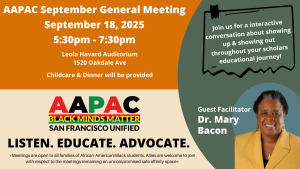 Join the AAPAC team and guest facilitator Dr. Mary Bacon for an interactive conversation about showing up and showing out throughout your scholar’s educational journey. Childcare and dinner will be provided. Their meetings are open to all families of African-American/Black students. Register today!