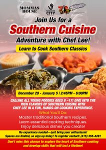Mommas house is hosting a Southern Cooking class from Sunday, December 29th to Sunday, January 5th from 2:45p-6p. RSVP via information on the flyer below. Don’t miss this chance to explore the heart of Southern cooking and develop skills that will last a lifetime. We will dive into the rich flavors of southern cuisine with Chef Lee in a fun, hands-on experience. This cooking class is for ages 8-17. No experience is needed, just your enthusiasm. Space is limited.