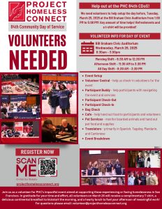 Project Homelessness Connect needs volunteers to help set up the day before and the day of their event. Any amount of time helps! Day of event shifts are in 4 hour increments: morning – 8:30a-12:30p, afternoon – 11:30a-3:30p, or all day – 8:30a-3:30p. Standard placements include: getting to know participants one-on-one as you help them navigate the space as a Participant Escort/Buddy, Participant Check-In, Translator, Cafe, Bag checker, and more. We take pride in ensuring that every role is meaningful and provide volunteer support, not to mention a free meal at the end of your shift and a PHC Volunteer T-Shirt for first-time volunteers. Sign up here: https://projecthomelessconnect.volunteerhub.com/vv2/