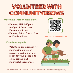 Help out by making sure their gardens are prepared for the programming that takes place there, ensuring that the youth in the programs can benefit from the healing qualities of being a steward of the land. Make sure to wear comfortable clothes that you won’t mind getting dirty, a reusable water bottle, and sunscreen! February 19th: 1:30pm to 3:30pm at Rosa Parks Elementary (1501 O’Farrell); February 28th: 10am to 12pm at Koshland Park (Page and Buchanan) Sign up for both dates here!
