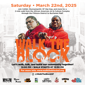 Join Cellski, Stunnaman02, SF Hip-Hop, and more for a 2 mile walk from the African American Arts and Culture Complex through the historic Fillmore District and back to the Buchanan Mall. Let’s walk, talk, and build community together. Visit https://sfhiphop.org/walktheblock for more information; RSVP on Eventbrite