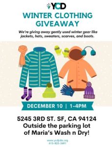 Come to YCD’s winter clothing giveaway, where they will be handing out donated coats, scarves, beanies, shoes, and more to those in need! Join us for the giveaway on: Wednesday, December 10th, 2025, from 1pm – 4pm, at Maria’s Wash N Dry, 5245 3rd Street.