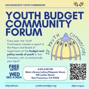 The Youth Commission wants to hear from YOU on the needs and priorities of youth in San Francisco. If you’re a young person living in San Francisco under the age of 25, please join us in sharing your input on how the City and County of San Francisco should be investing in the needs of young people. There will be a quick presentation on how city budgets work, snacks, and light refreshments! RSVP here!