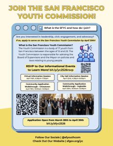 The San Francisco Youth Commission’s 2025/26 application is now live! To be eligible to serve, you must be a resident of the City & County of San Francisco and be between the ages of 12 and 23 years old. The YC application consists of 6 essay-style questions, as well as demographic information, and an optional letter of recommendation. There’s also an alternative choice to submit a video answering the 6 questions instead of the written format. If interested, sign up for an information session here: https://bit.ly/yc2526rsvp  Applications will be accepted until Wednesday, April 30th.