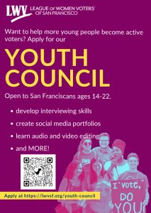 If you are, or know someone, between the ages of 14–22, is a Bay Area resident who loves San Francisco, and wants to help more young people become active voters, then this opportunity is for you. The council meets once a month for one-year terms to produce civic education resources and a get-out-the-vote project focused on young people. Those who complete their one-year term will receive a letter of recommendation useful for school applications and a LinkedIn recommendation. Apply online!